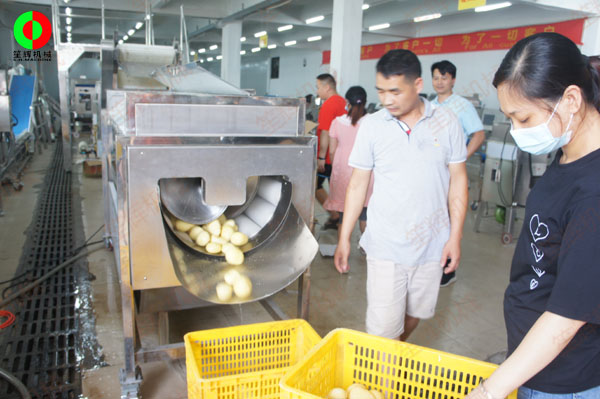 連續(xù)式土豆去皮機針對客戶帶來的大批土豆現(xiàn)場進行加工處理測試,提升機自動上料,螺旋自動送料出料,時產(chǎn)4頓,物料處理效果令來自中山的客戶非常滿意!